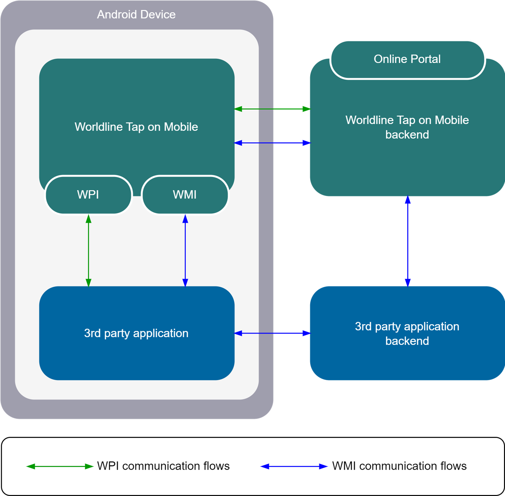 This page is intended for third-party application providers who wish to develop business applications interacting with Worldline Tap on Mobile application and explicitly covers the supplementary management processes which currently are built around the integrated registration functions. All payment context uses cases and operations are defined by Worldline Payment Interface. All source code examples used in this document are written in Kotlin (Android). High level architecture and interfaces view including Worldline Payment Interface and Tap on Mobile Management Interface flows is presented below.