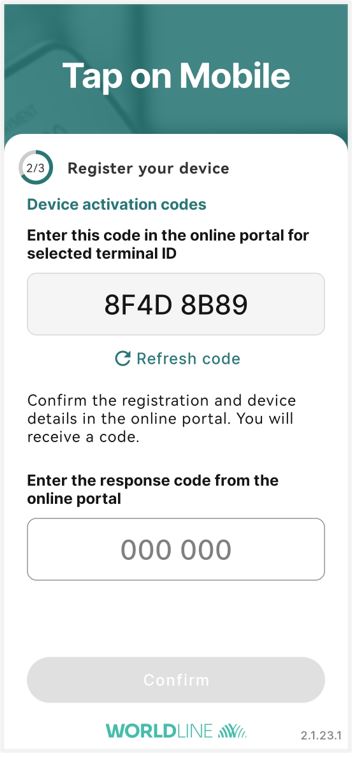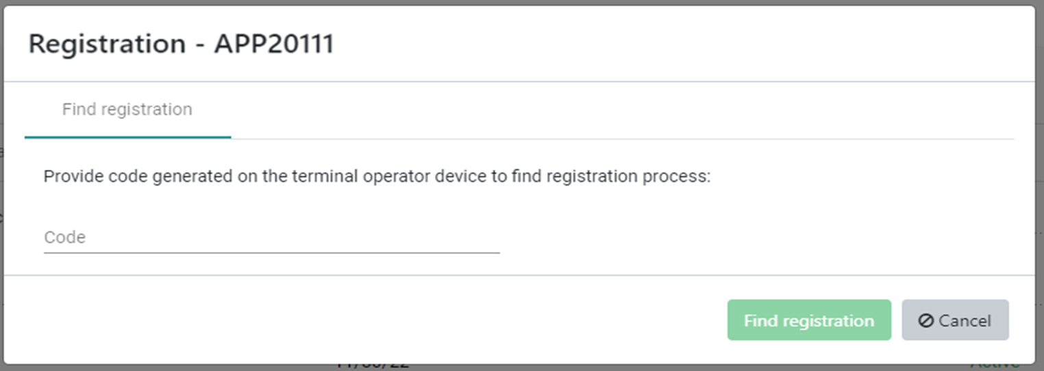 The displayed code of the Worldline Tap on Mobile app needs to be entered in the ‘Code’ field of the online Portal. Afterwards click Find registration .