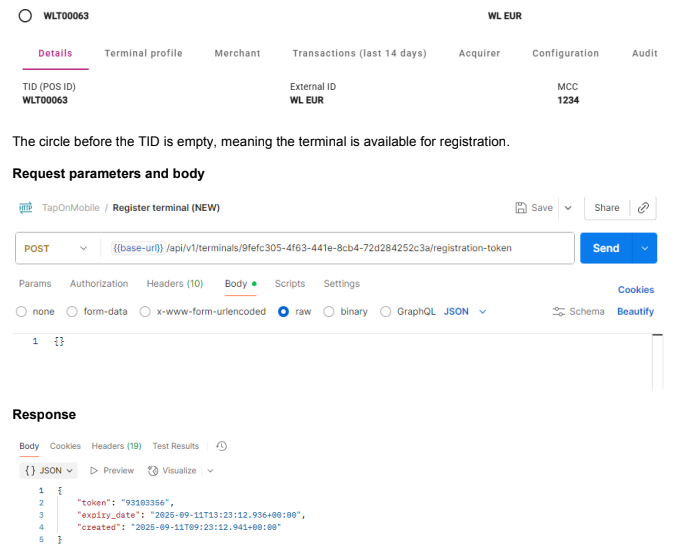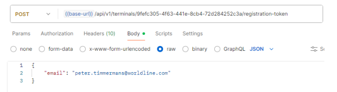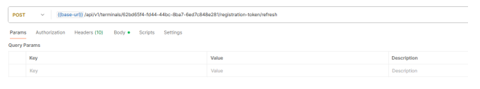 Once an available terminal has been selected, a registration token can be requested from the backend using the API call POST /api/v1/terminals/{id}/registration-token , where id a terminal UUID stored in ToM backend.