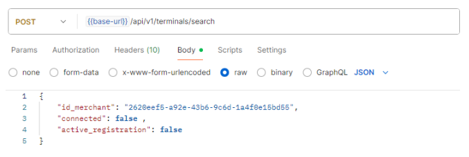 When making a search for an available temrinal, several filters can be added to the request body. below is a sample terminal search request. If the OAuth2 credentials are linked to multiple merchant ID, id_merchant has to be specified, connected to find a terminal that is not yet in use and active_registration to assure that the registration process has not yet started.